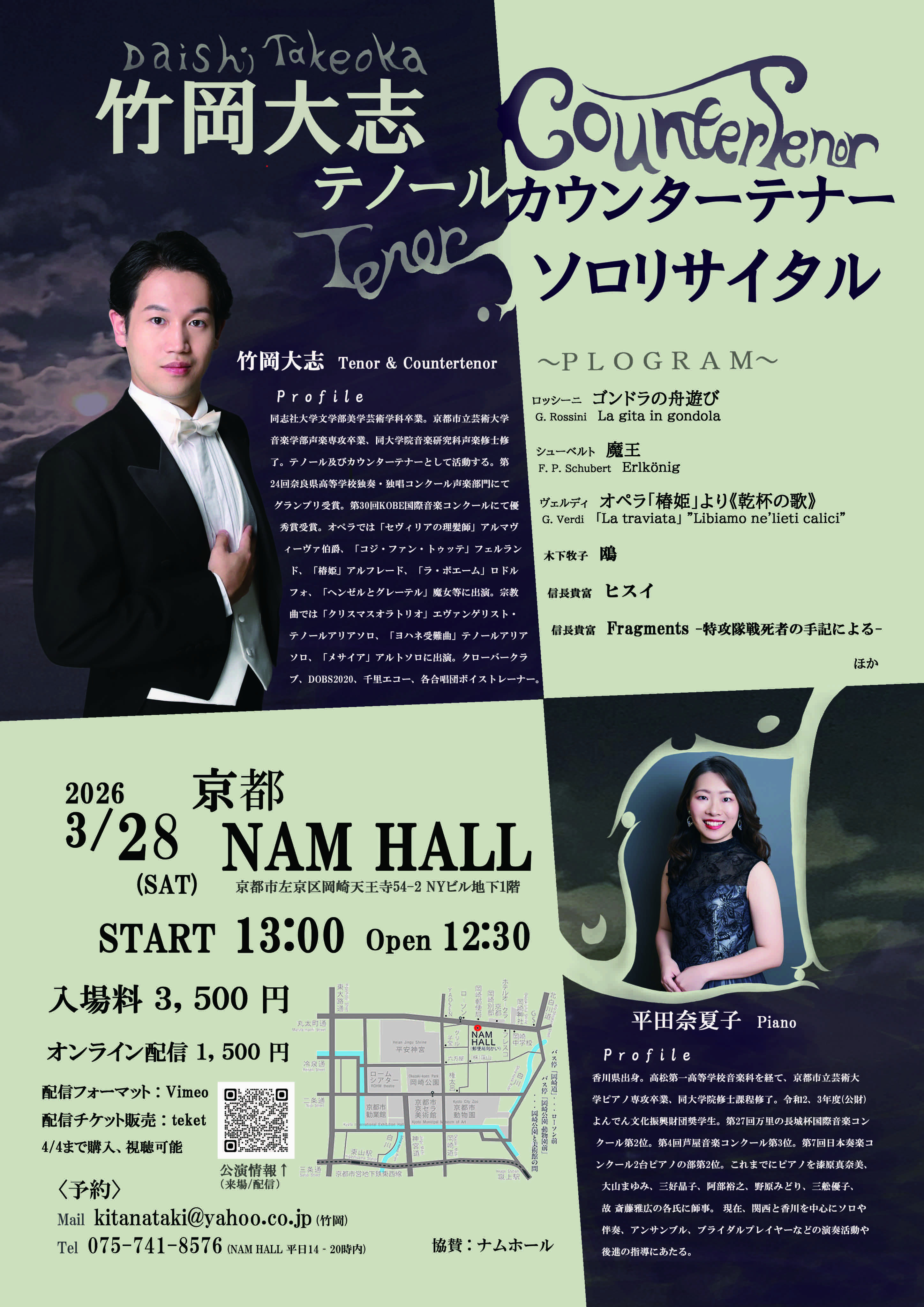 テノール(男声地声の高音域)とカウンターテナー(裏声を使った女声音域)のどちらの声も竹岡1人で歌唱する演奏会になります。1曲の中でどちらの声も使って歌唱し、男女のデュエット曲を1人で歌ったりなど、他では聴けないような曲芸も披露します。また、本演奏会は通常通り会場でご覧になる以外にもオンラインチケットをご購入いただくことで、演奏日から4/4までの間にご自由にご自宅のネット環境でご覧いただけます。もし、ご興味あるけれどもご予定が合わなかったり、遠方のため行きにくいという方は、こちらのオンライン配信チケットもご検討いただければありがたいです。