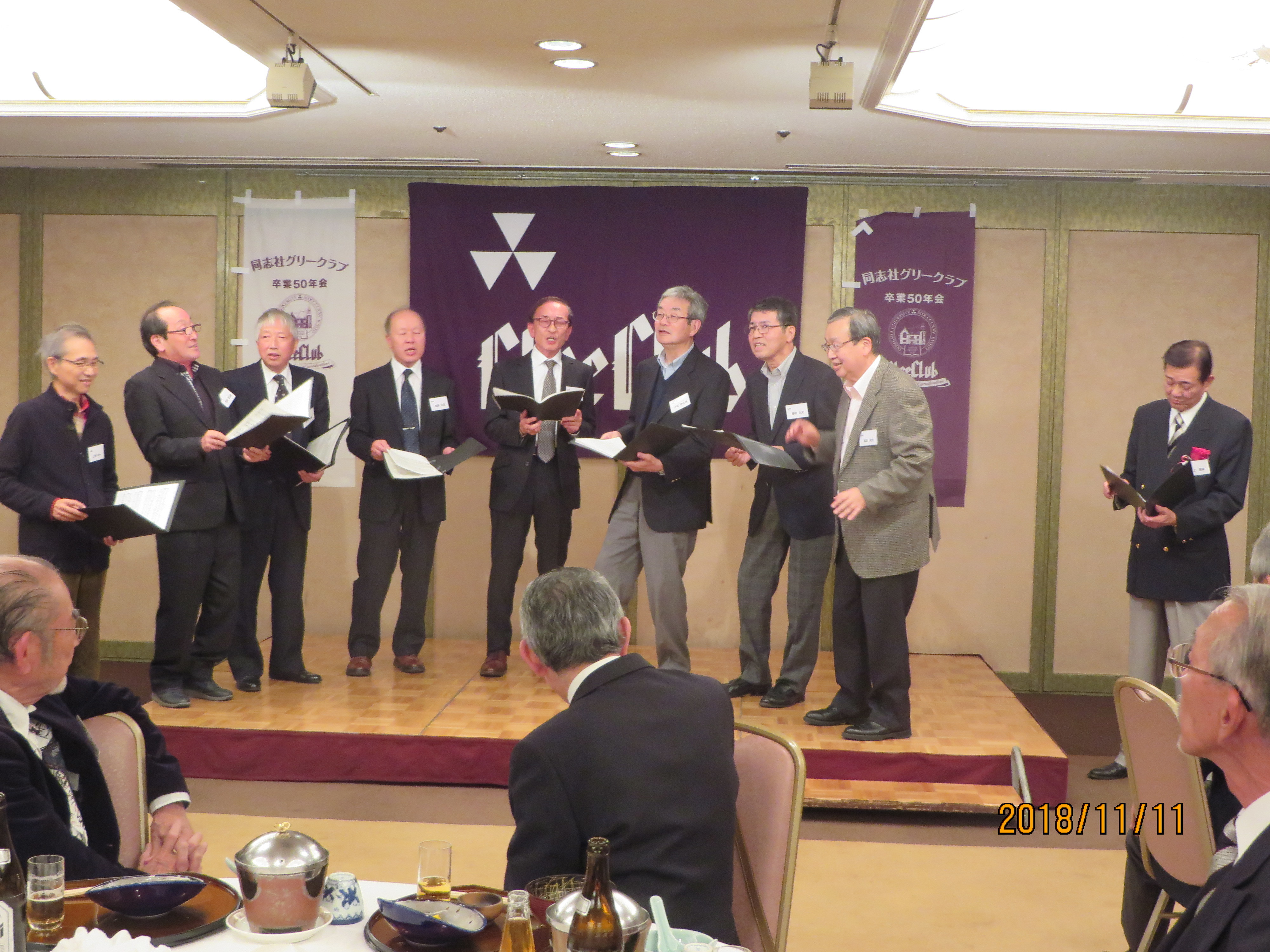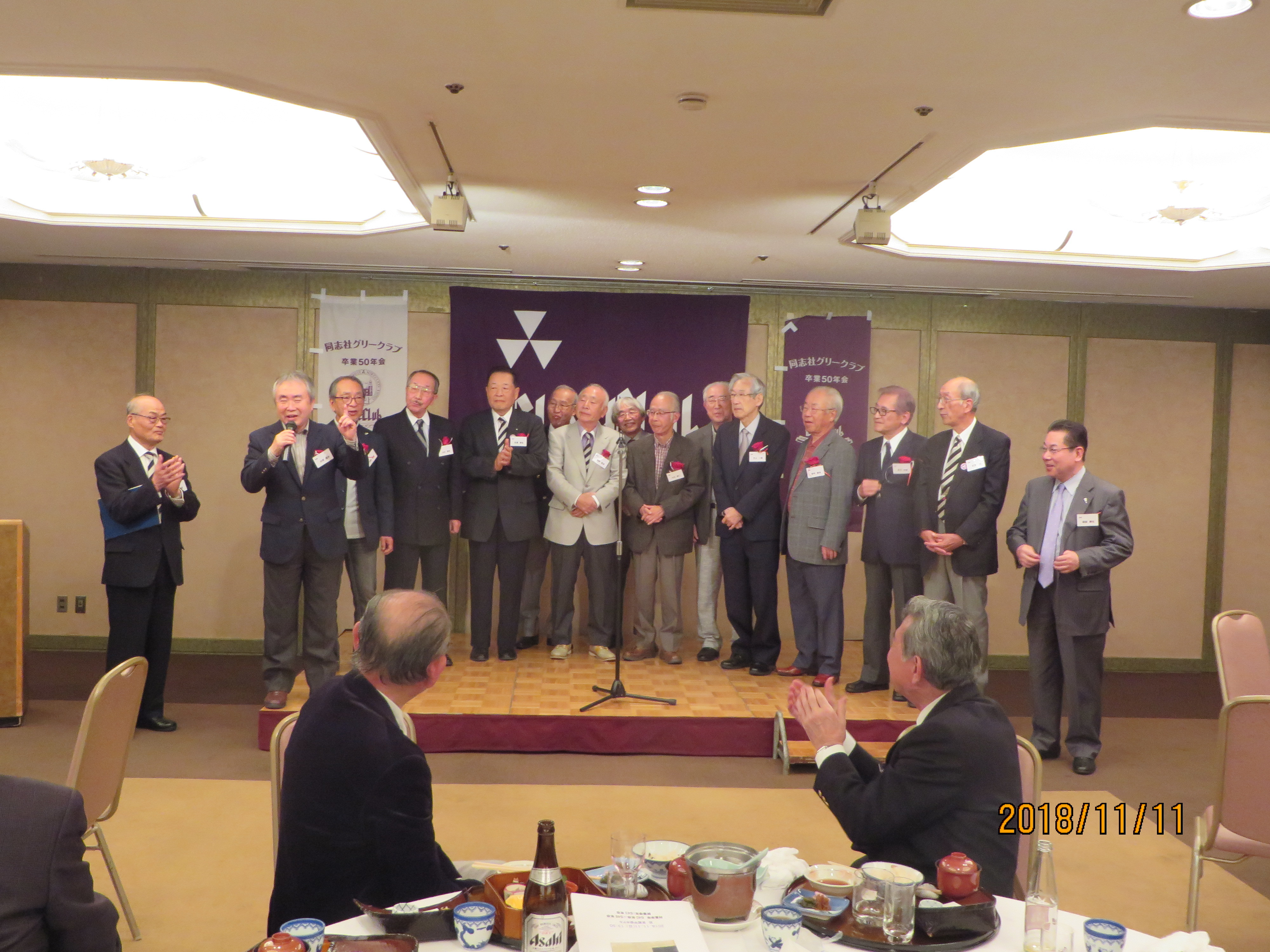 会を終えて、小亀 豊さん(昭和41年)から慰労のメールをいただきました。その中に「・・・この50年会は、もちろん30年会、40年会の催しも総合して、グリーの文化の継承、グリーメンしか体験しない、ある種の青春から今までの人生の来し方を表現した、素晴らしいイベント。また同志社グリーだからこそ味わえる名イベントだと言えます。この仕組みやシステムを考案された先人に実に感謝したいですね。また、これを代々大切に継承して来た後世の今回の43年組の皆さま、そしてわたしたちも大いに賞賛され、誇りたいものですね。」と綴られていました。終わってみると心にしみます。