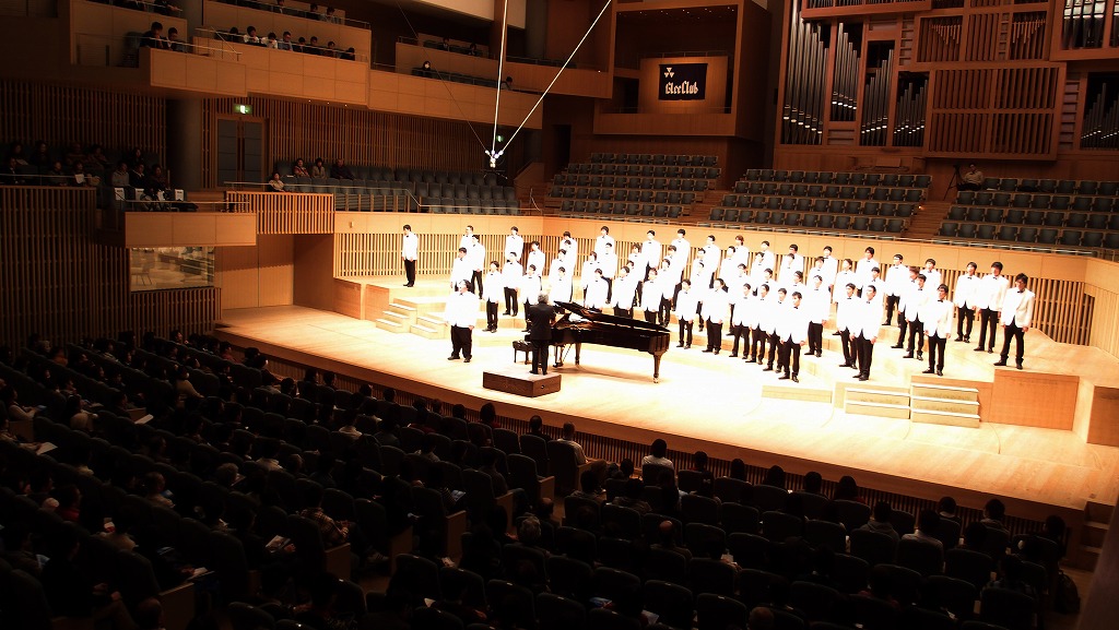 少し寒さが和らいだ師走の京都でした。同志社グリークラブ恒例の第109回定期演奏会の開催される京都コンサートホール大ホールには、開場前から長蛇の列が出来ていました。開場が始まると、どんどんお客さまが入場され、ホールのホワイエは多くのOBが顔を見せており、和やかな雰囲気で開宴を待っていました。撮影位置に座わって見渡すと、ホールは3階席までほぼ満員。