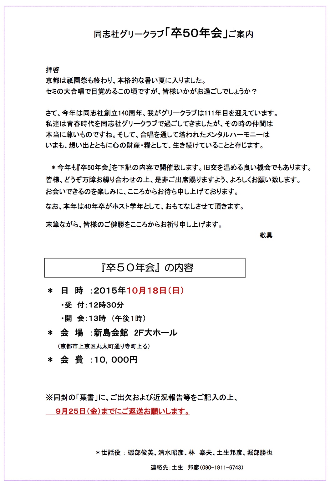 〈周年会情報〉卒団50年会開催のお知らせ