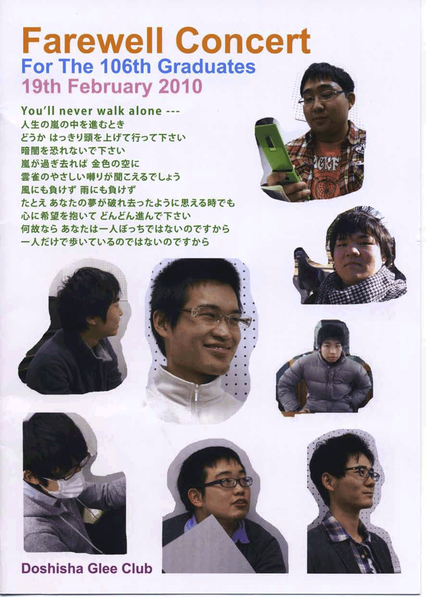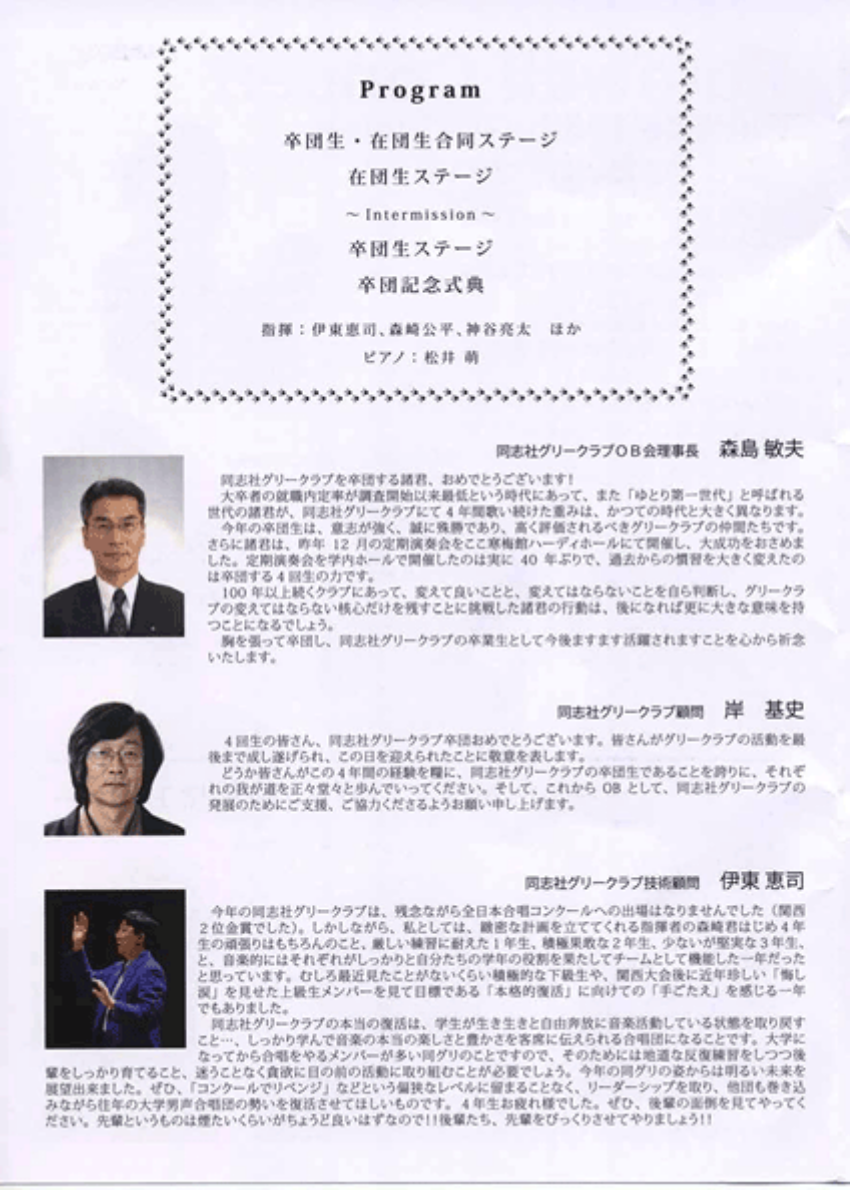 同志社グリークラブの卒業生としての誇りを胸に、今後ますます活躍されますことを心から祈念いたします。