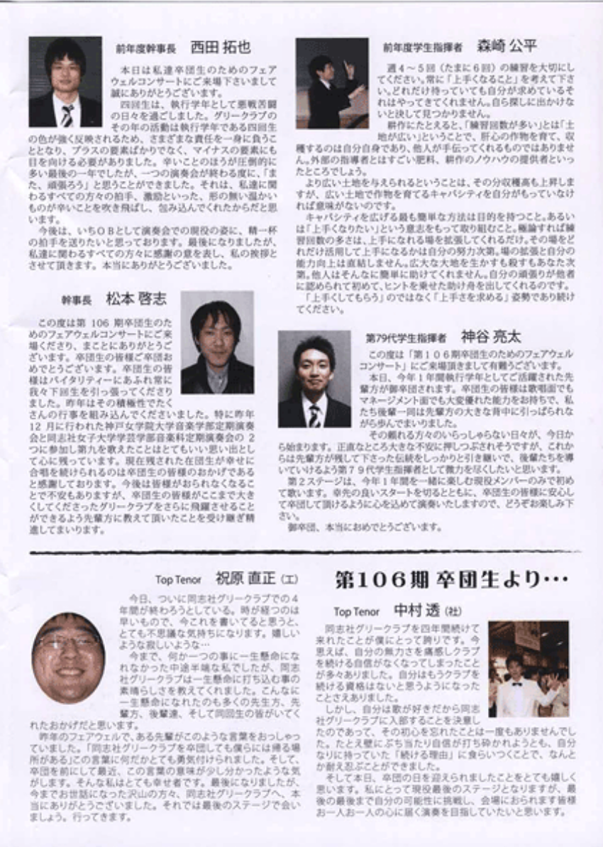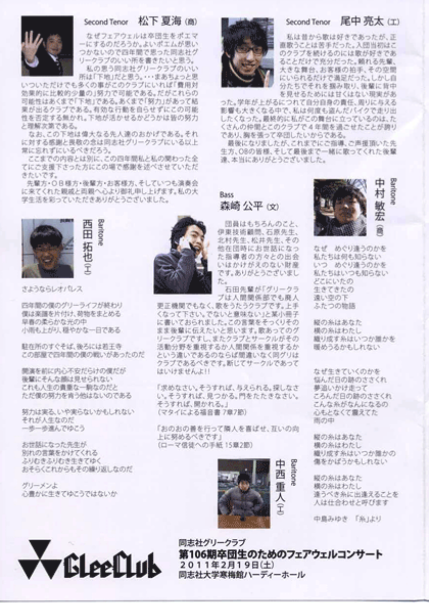 同志社グリークラブを卒業した7名の皆さん、おめでとうございます!心からおよろこび申しあげます。そして同志社グリークラブOB会への入団を心より歓迎いたします。大卒者の就職内定率が調査開始以来最低を記録したという厳しい時代にあって、また「ゆとり教育第一世代」と呼ばれる世代の皆さんがグリークラブにおいて4年間歌い続けた重みは、かつての時代と大きく異なります。今年の卒業生は、誠に意志が強く、長い歴史のなかでも高く評価されるべきグリークラブの仲間たちです。