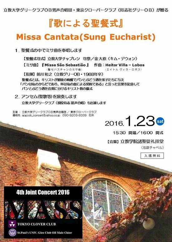東京では夜には雪なるかもしれないとの、天気予報の出ていた平成28年1月23日(土)に、立教大学チャペル(立教学院諸聖徒礼拝堂)で、通常文ミサの礼拝形式で行われた「歌による聖餐式」に東京クローバークラブは立教大学OB男声合唱団のお誘いを受けて、礼拝に参列させて頂きました。東京クローバークラブが、「歌による聖餐式」に参列するのは2010年1月(司式・説教 柳司祭)につづき今回は2回目でした。