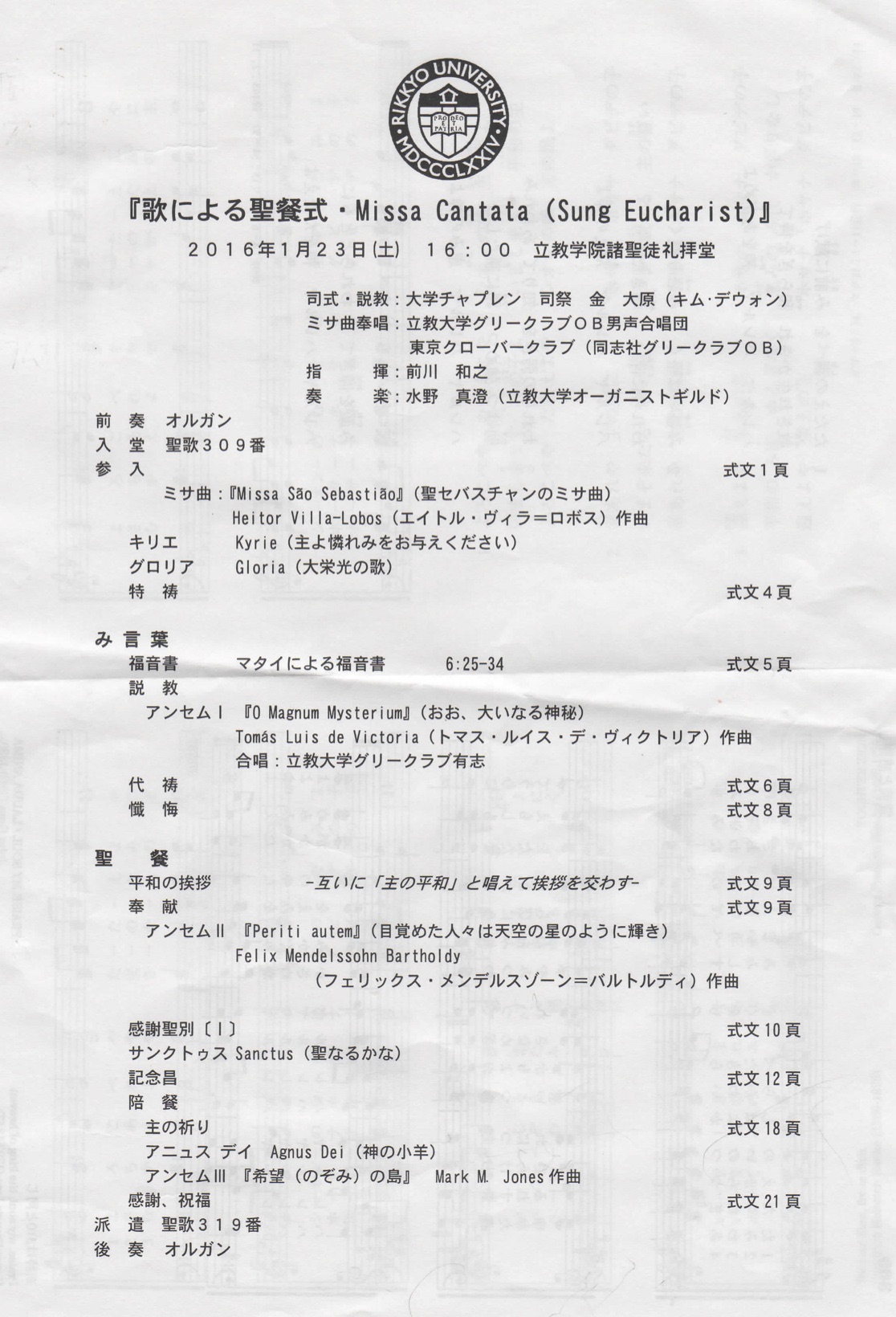 式文に沿って、「キリエ」・「グロリア」・聖書拝読・説教・アンセムⅠ・聖餐・アンセムⅡ・「サンクトゥス」・陪餐・「アニュス デイ」・「ベネディクトゥス」・アンセムⅢ・祝祷、と進められ、アンセムⅠは立教大学グリークラブ現役有志による「O Magnum Mysterium」(トマス・ルイス・デ・ヴィクトリア作曲)。アンセムⅡ「Periti autem」(フェリックス・メンデルスゾーン作曲)、とアンセムⅢ「希望の島」(マーク・ジョーンズ作曲)の2曲は、立教大学グリークラブOBと東京クローバークラブで合同奉唱しました。ミサ曲奉唱の中で「クレド」については金チャプレンから「信者だけの場ではないので『信仰宣言』は不要」との事で割愛しました。