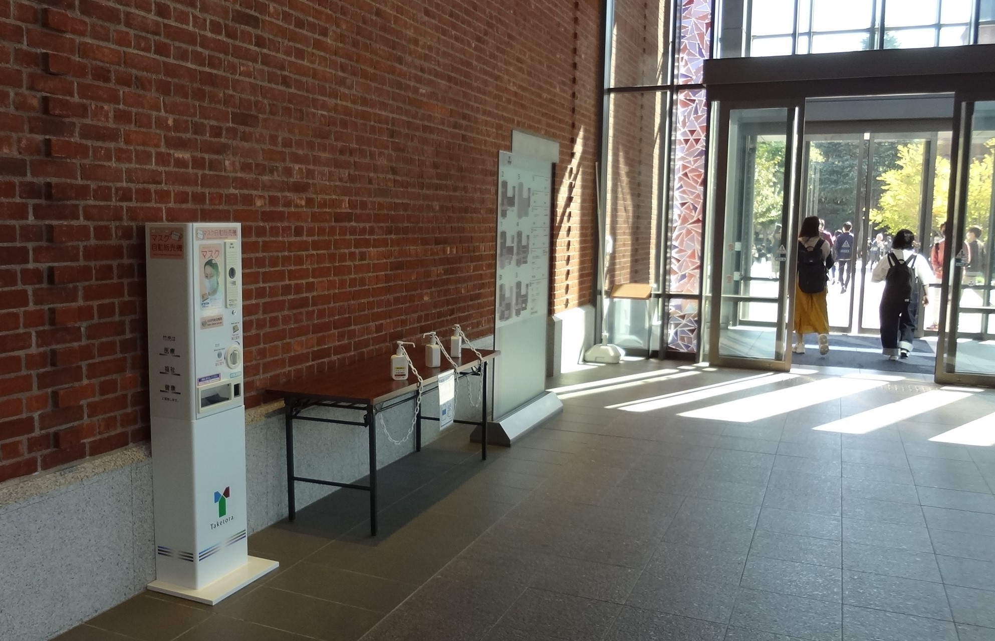 ※写真は「構内に設置されたマスクの自動販売機とアルコール消毒液」