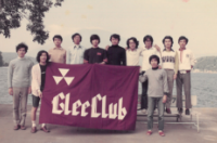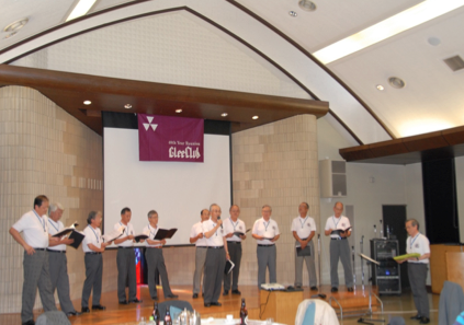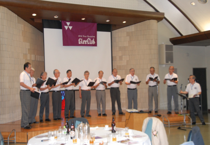 そこで、今回参加される48年卒、49年卒、50年卒、52年卒、53年卒、54年卒の幹事の方々にグリーの頃の写真の送付と、当日に5分から10分お話していただくことをお願いしました。今回の会のテーマを「あの頃、みんな○○だった」に決めて、当日の流れの作成に入りました。そして迎えた当日、11時頃には、この会で3回目のフェアウェルを迎える48年卒の方々の練習が始まると、この後に続くひと時への期待が膨らみます。午後1時に参集し、「Hail Our Glee Club」で会が始まりました。指揮は、参加者の中で唯一、学指揮経験者。53年卒の林君にお願いすることができました。