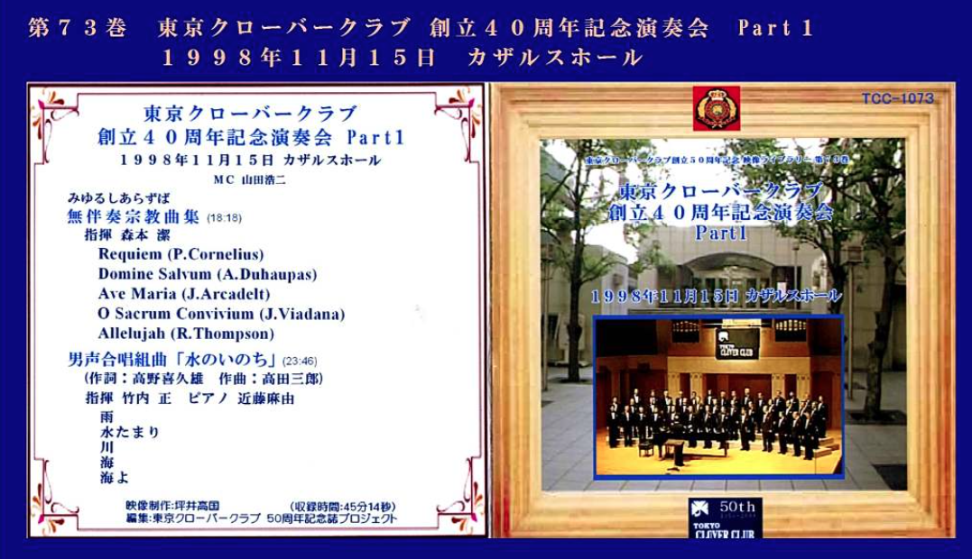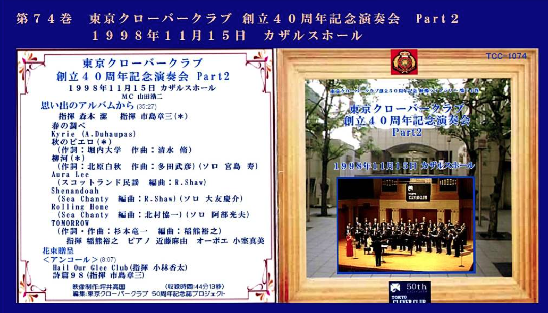 この企画は東京クローバークラブ創立50周年企画としてスタートしました。発案は市島章三さん(昭和34年卒)で、50周年の年、2008年の7月、新大久保の辻スタジオの練習後にルノアールで初めての打ち合わせが持たれました。プロジェクトのメンバーはリーダーの市島さん、森本潔さん(昭和36年卒)、岩木六馬さん(昭和39年卒)、池田研一さん(昭和42年卒)、幹事長の荒井直さんその他数名の方々でした。プロジェクトチームは市島さんがチーフで森本さん、岩木さん、池田さん、私と5人のチームで、市島さんから趣旨の説明があり、市島さんのご指名で私が制作を担当することになりました。CDは作ったことがありましたが動画、DVDは未経験でしたが、興味があったので挑戦することにしました。TCCの皆さんに手持ちのビデオテープを提供していただいたところ、30本ほどでしたので、それほど手間はかからないだろうと考えていました。