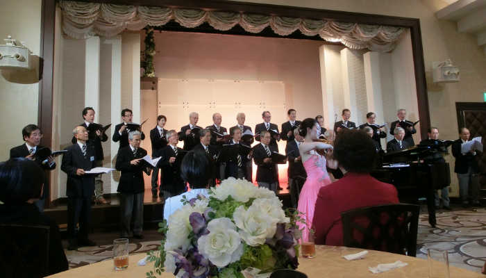 その後パーティに移り、ビュッフェスタイルの食事と飲み放題で大いに盛り上がりました。お楽しみとして昨年に続き「カルテット大会」を催しました。3組の参加でしたが、前回大評判だったと勝手に思っているマネージャー4名(T1.伏村 T2. 橋本 B1.西村肇 B2.松本)による'ヘルパー4'(意味はよくお考え下さい)の演奏、今回も大好評で終わったと信じていますが、個人的にはもうこれっきりにしたいというのが本音です。今年も参加していただいたOB会・芦田理事長からも「良いファミリーコンサートですね」との言葉をもらい感謝しております。