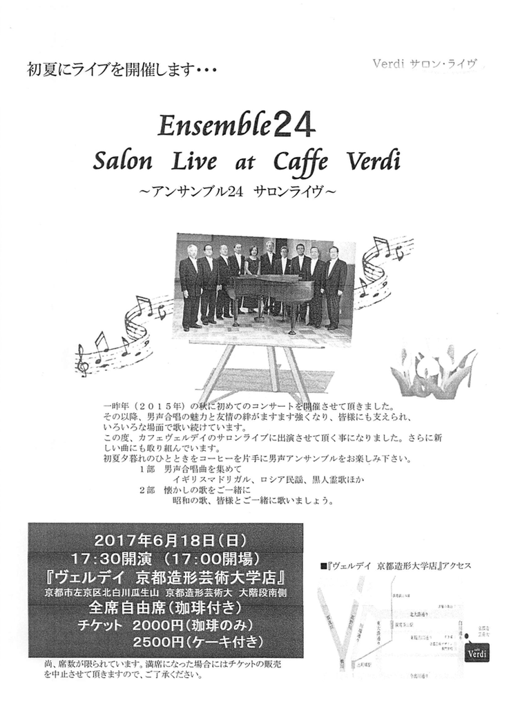 このカフェレストラン『ヴェルデイ』では毎週日曜日に特にクラシックの紹介の場としてライブを開催しています。たまたまこのライブのディレクターが一昨年の私共の演奏をお聞きになり、今回のライブの場を設けて頂きました。実はこの方は早稲田グリーのOBで、「大人が余裕を持ってしっかりと受け止める音楽」を探していたところ私達の演奏が目にとまったそうです。当日はコーヒーとケーキを食べながらのゆったりした雰囲気の中で進められました。全体は2部構成で1部はグリー時代に慣れ親しんだ男声曲を9名の小アンサンブル風に歌いました。イギリスのマドリガル『TEN GLEES』からの選曲はその雰囲気にぴったり、楽しく美しく躍動的な演奏が出来ました。その他にロシア民謡、黒人霊歌、日本民謡などで雰囲気を盛リあげ、2部では『昭和の歌を皆様とご一緒に』をテーマにダークダックス、デユークエイセスの曲やザピーナツ・メドレーを私達用のアレンジで演奏、最後は皆様と『夏は来ぬ』『翼をください』を歌って締めくくりました。