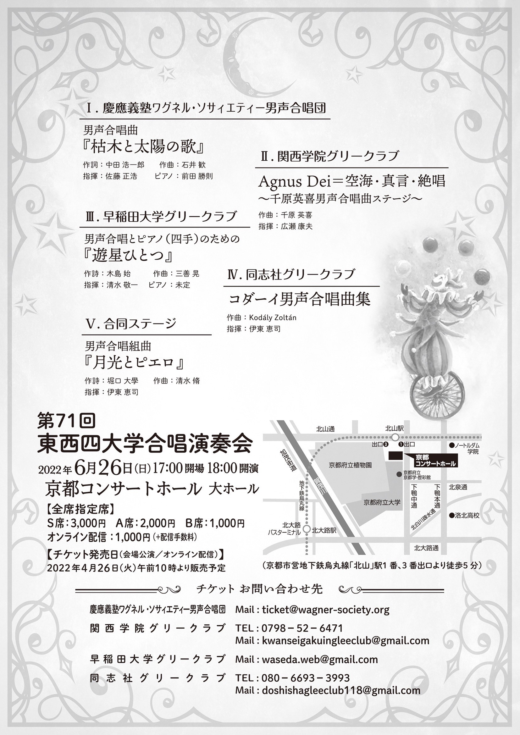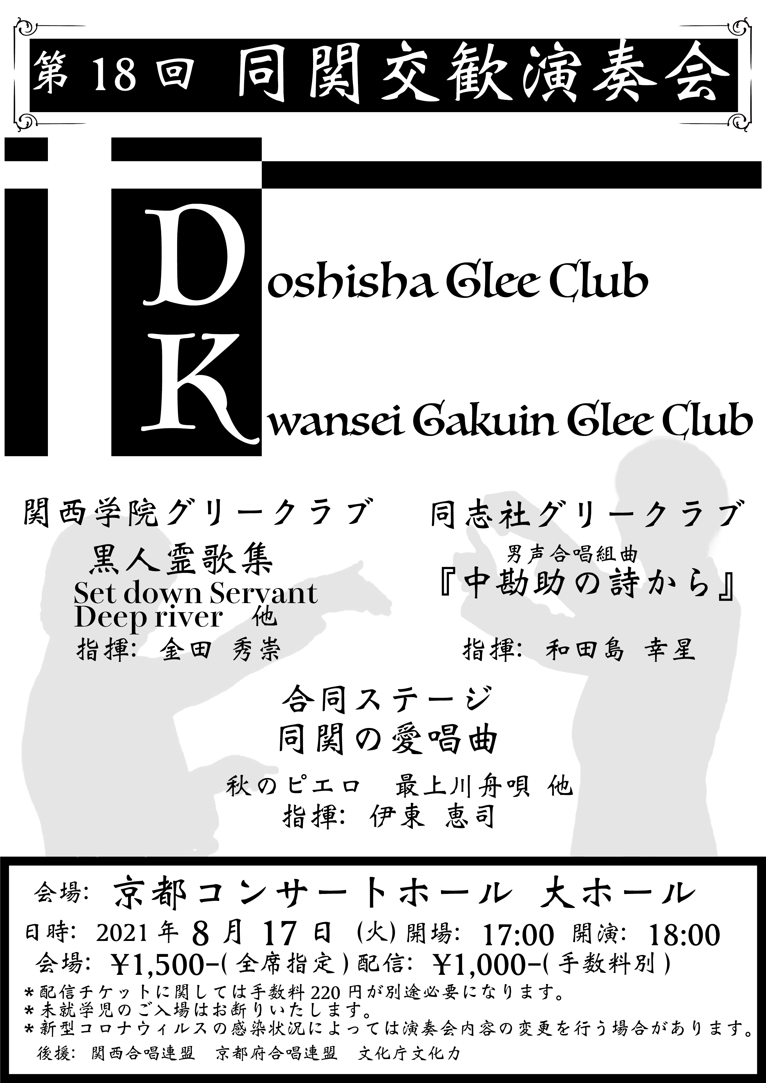 なお、新型コロナ感染拡大による緊急事態宣言が京都府下に現在も発令されているため、今回のフェアウェルコンサートは『グリークラブ団員と大学関係者のみ入場可』にて開催されます。