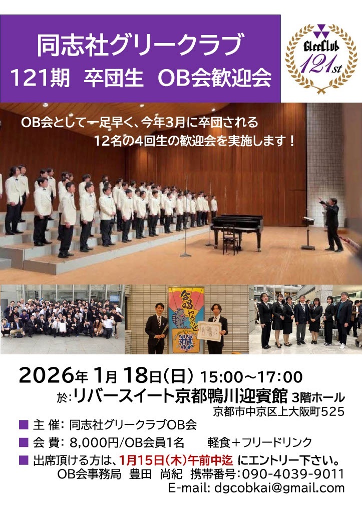 同志社グリークラブ第116期卒団生のためのフェアウェルコンサートが2021年3月6日(土)に開催されることとなりました。